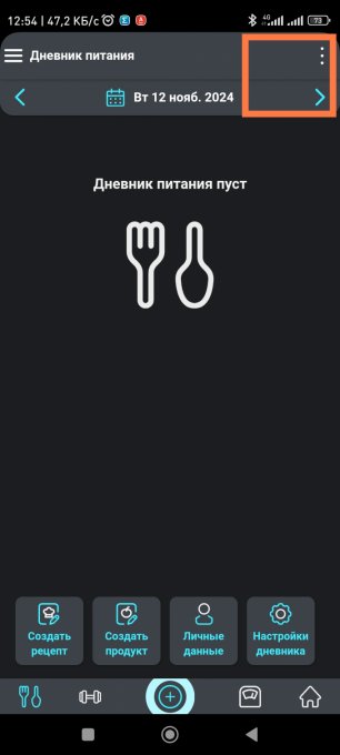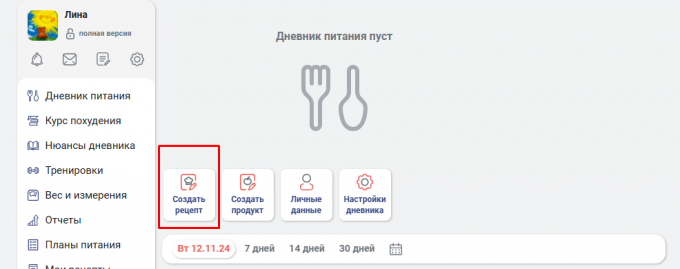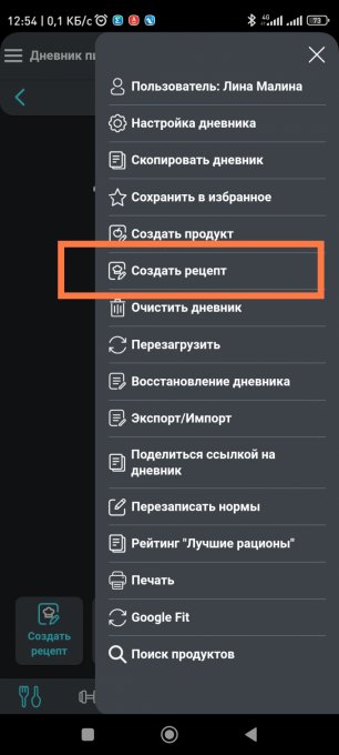 Открыть Дневник питания, справа три точки, создать рецепт.
