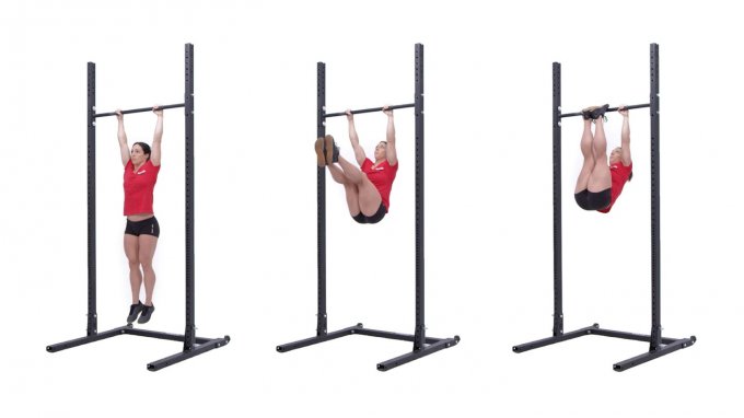 На выдохе плавно поднять ноги вверх до касания стопами турника. Если не хватает растяжки, чтобы поднять прямые ноги, можно чуть согнуть колени.
