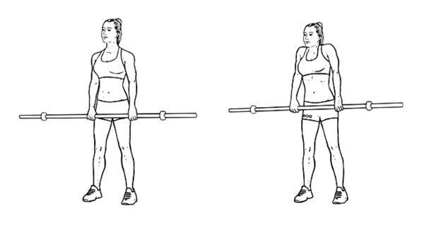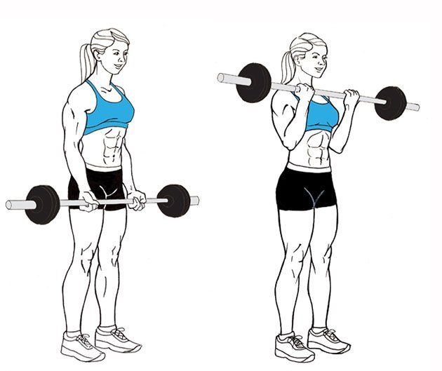 На выдохе, сгибая руки в локтях, штанга поднимается до уровня плеч, но не выше.