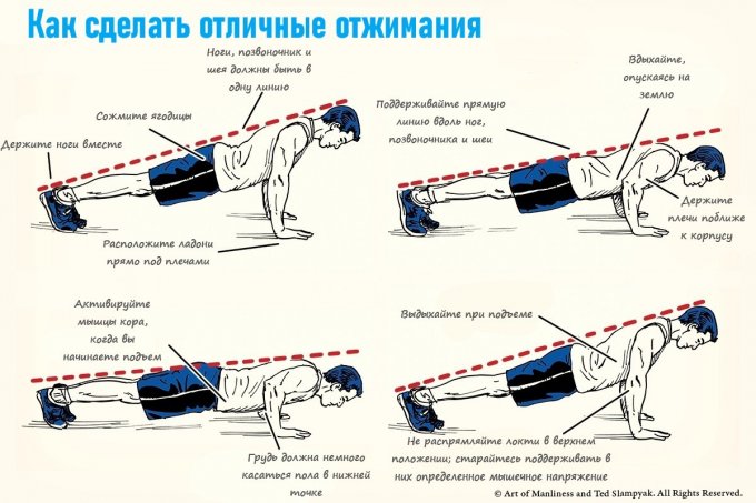 Распространённые погрешности — прогиб в пояснице и оттопыренный таз. Во время отжиманий тело должно копировать анатомически правильное положение позвоночника. Важно следить, чтобы за естественными изгибами тела.