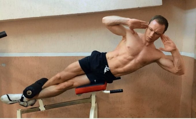 разместиться боком в тренажёре, ноги выпрямлены, ступни закреплены под валиками, корпус тела «висит» в воздухе. Руки за головой или скрещены на груди.