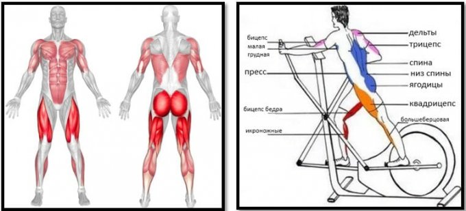 На эллиптическом тренажёре акцентировано задействованы все мышцы ног, а также более-менее равномерно работают остальные мышцы тела. Нагрузка приходится также на сердечную мышцу и лёгкие. На беговой дорожке наибольшая нагрузка приходится на ноги. Активно работает сердечно-сосудистая и дыхательная системы.