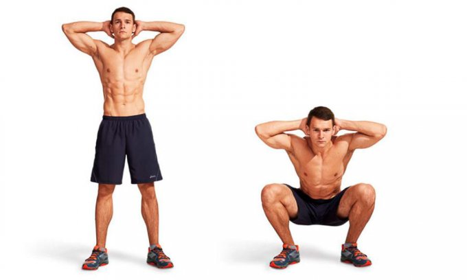 Сделать вдох, напрячь мышцы живота и спины и начать приседание.