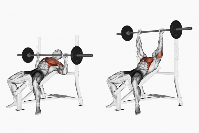 Сесть в скамью для жима под углом 30–45°, лопатки прижаты к