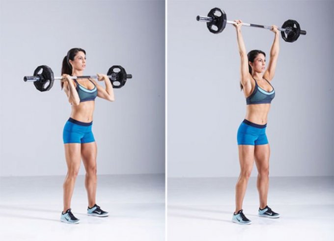 2. На выдохе плавно выжмите штангу вертикально вверх, выпрямляя руки.