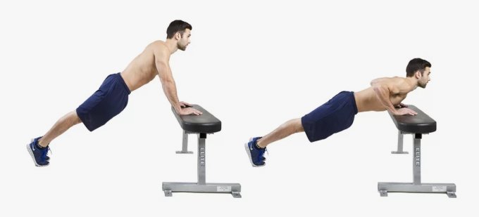Нужно поставить руки на ширине плеч, ладони разместить на уровне груди, пальцы направить вперёд. Контролировать корпус — ноги и спина должны находиться на одной линии. Не прогибаться. Медленно выполнять отжимания, касаясь грудью скамьи. Так же плавно возвращаться в исходное положение.