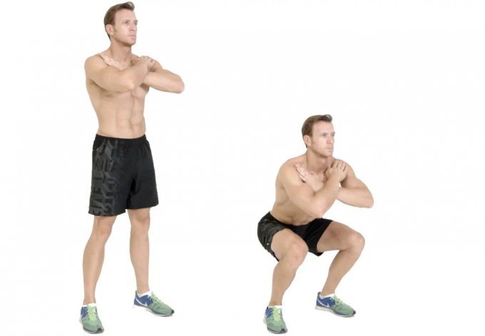 Исходное положение: ноги чуть шире плеч, стопы параллельно друг другу, руки вытянуты перед собой или сомкнуты в замок.