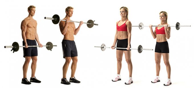 На выдохе, сгибая руки в локтях, штанга поднимается до уровня плеч,