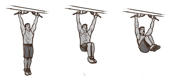 обычные подъёмы ног к перекладине не менее 15 раз и подержать