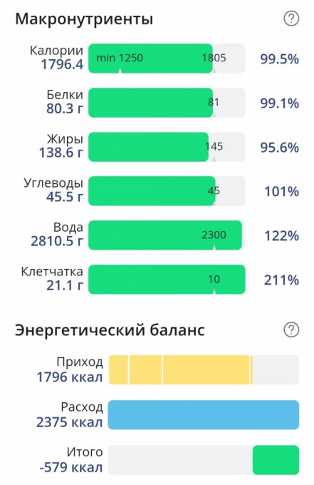 | Итого за день | 2900 | 1560 | 55 | 94 | 106 |