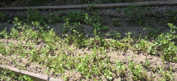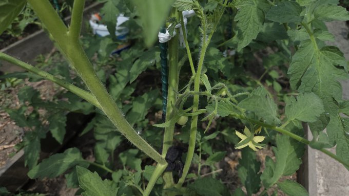 В огороде поработала 2 часа. Томаты, посеянные 2 апреля на рассаду активно растут, цветет уже вторая кисть и есть завязи. Полив в борозды, они замульчированы для меньшего испарения влаги.